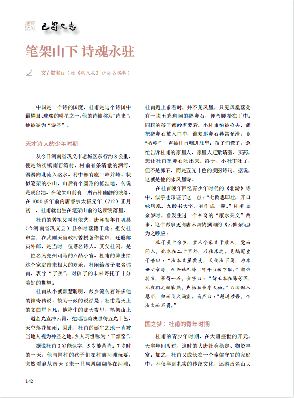 在杜甫晚年回忆青少年时代的《壮游》诗中,似乎也印证了这一点:“七龄思即壮,开口咏凤凰。九龄书大字,有作成一囊。”杜甫10余岁时,曾发生过一个神奇的“康水采文”故事,这个故事更有唐末冯贽撰写的《云仙杂记》为之呼应: