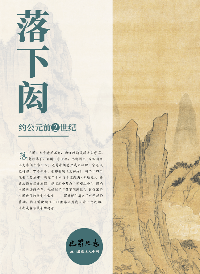 农业是中国古代的命脉,而历法则是牵引命脉的绳索。中国最古老的历法,至今已有4000多年历史。在漫长的农业社会时代,历法经过无数次大大小小的演变,才不断走向丰富和科学。作为四川历史名人,落下闳,是影响中国古代历法的一个关键人物。落下闳出生在阆中桥楼的落阳山下,此山扼古蜀道咽喉,适宜于天文观测。在这里,落下闳竖竿观日,以竿影长短确定出“夏至”“冬至”。又根据一年中昼夜的长短变化确定出“春分”“秋分”,对黄赤交角进行较为科学的测量。他创制了天文观测仪,即著名的“落下闳浑仪”,该仪器为中国古代的重要宇宙观——张衡的“浑天说”奠定了科学理论基础。