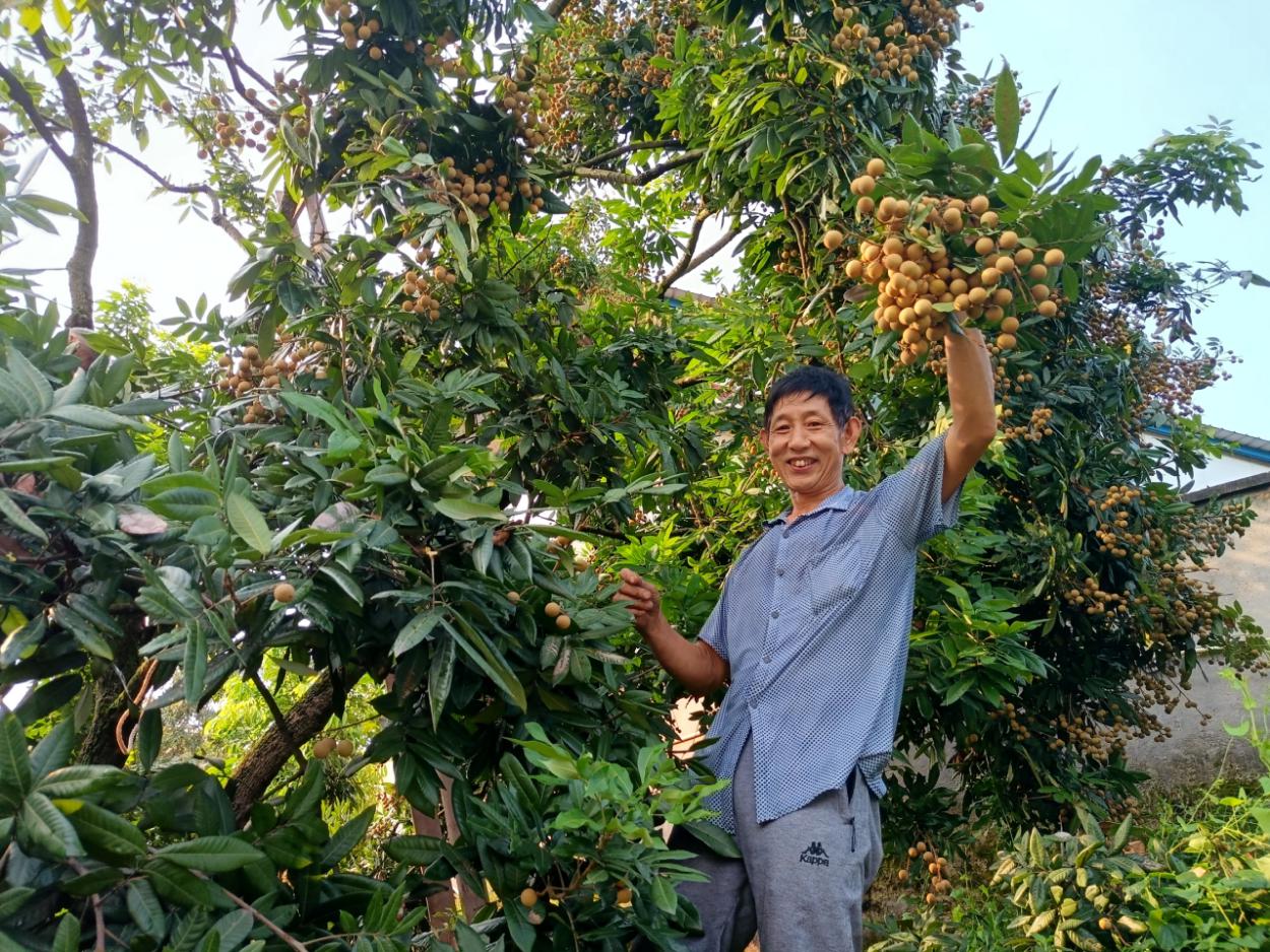 泸县潮河镇后湾村村民罗代林扬起了刚采摘的鲜桂圆