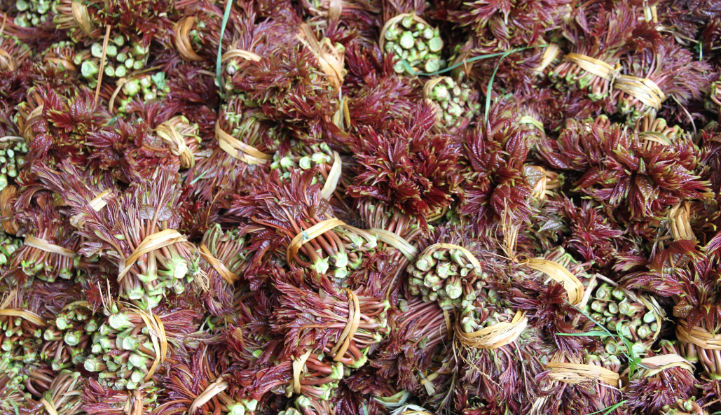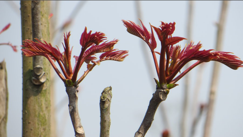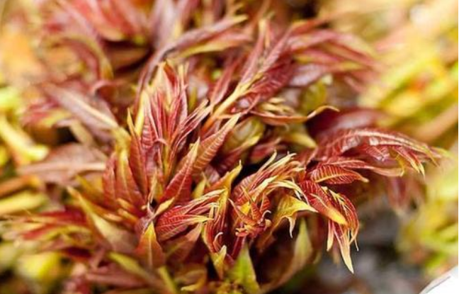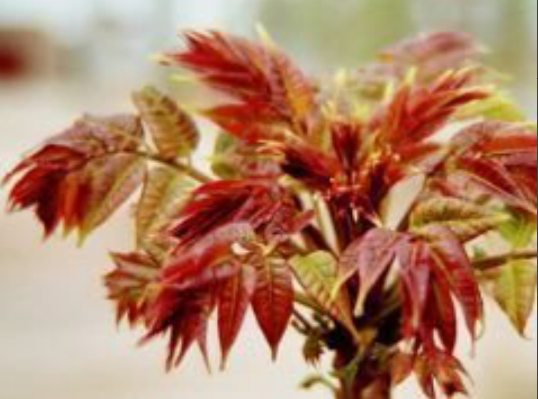 红油椿 椿芽初生时芽薹及嫩叶为鲜红色,油亮,5~7天后颜色加深,长成商品芽约需8~12天。