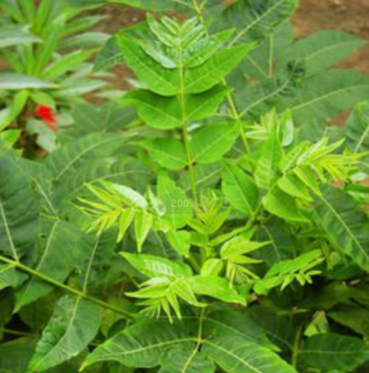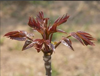 褐香椿 椿芽初生时芽薹及嫩叶为褐红色,鲜亮,芽粗壮,小叶叶片较大,肥厚,皱缩深,微被白色茸毛,长成商品芽约需8~12天。