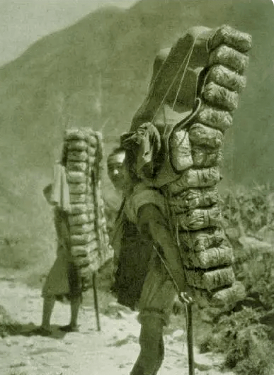 1903年,法国驻云南总领事方苏雅经云南到四川时,在一条崎岖的川藏山道上,发现了一群奇特的人,他们人人头顶大草帽,手持一根丁字形拐杖,一块圆形的篾条挂在胸前,身后则背着一团高大而沉重的包裹。他们是什么人,为什么会出现在川藏山道上,他们的包裹里装着的又是什么呢?《四川川茶志》,今天就来跟大家聊一聊,川藏茶马古道上的背夫。