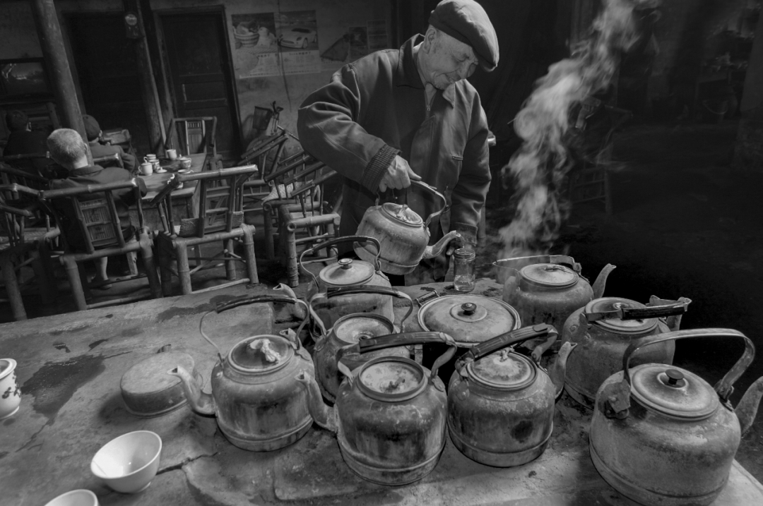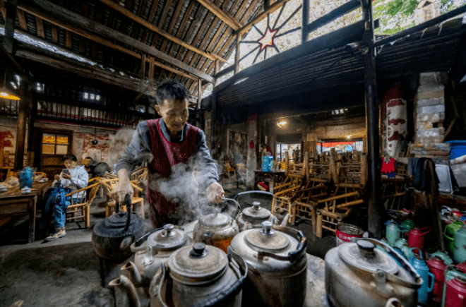 观音阁老茶馆里的堂倌(图片来源:双流融媒全媒体)