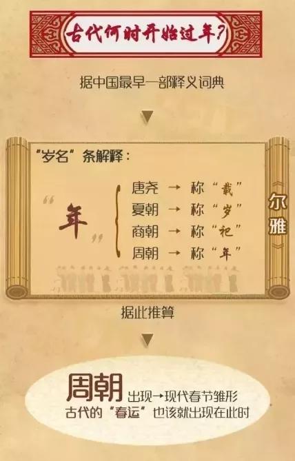 据中国最早一部释义词典《尔雅》“岁名”条解释,“年”在唐尧时称为“载”、夏代称为“岁”,商代称为“祀”,一直到周代才称为“年”。据此可以推出,在周代出现了现代春节的雏形——过年,古代的“春运”也就应该出现在这个时候。