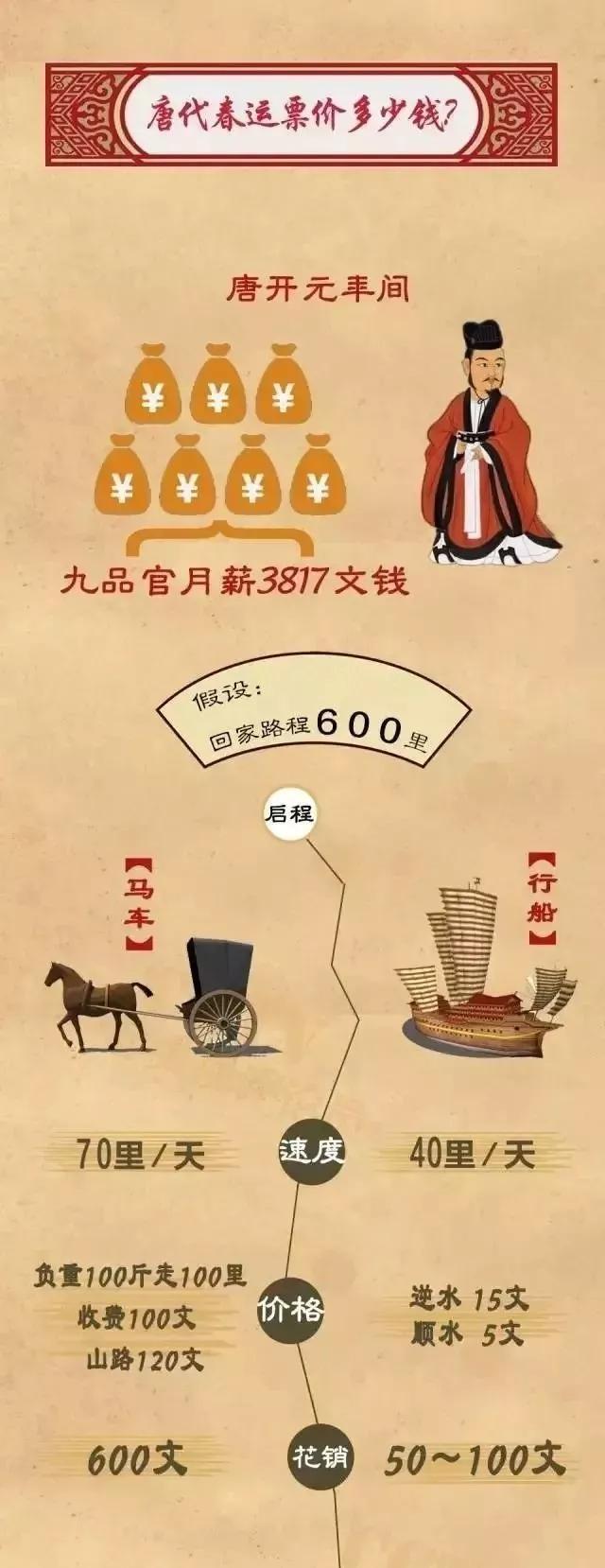 为了抑制哄抬物价,古代的春运常常有全国统一的价格。如在唐代,商业运输便有一个全国统一价,并设有最高和最低限价,连里程速度都有详细规定。以唐开元年间为例,当时相当于现在基层股级干部的九品官,一个月工资为3817文,日收入约127文。以“二人顶一驮”来说,抬着100斤的东西走100里,每人可以得50文;以每天走50里来说,日收入25文,这在当时可买2斗米(约25斤);车载1000斤,走100里,运费900文;每驮100斤,走100里,运费100文;走山坡道路100里,运费120文。所以当时的运费并不高。如果走水路,更便宜,“坐船回家”是古人春运时的首选。