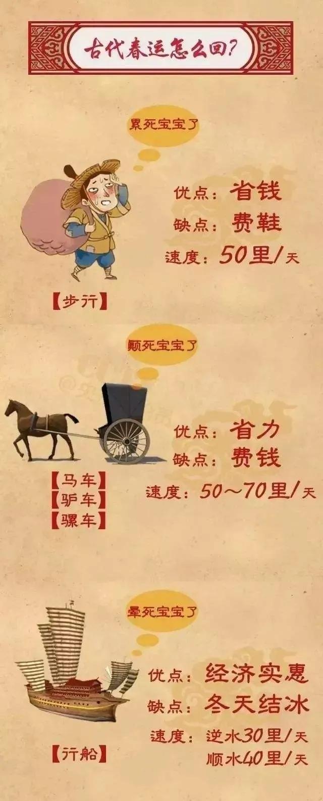 古代的春运主要是经水路和陆路。“两岸猿声啼不住,轻舟已过万重山。”从李白的这首《朝发白帝城》里,我们可以看出,唐代的水运已非常发达。至于陆运,早在黄帝时代就开始有车了,然后是辇、轿子等。畜力车相当普遍,马、骡、驴、牛等皆可供驱使,其中,马车是最主要的春运工具,堪称现代大巴。