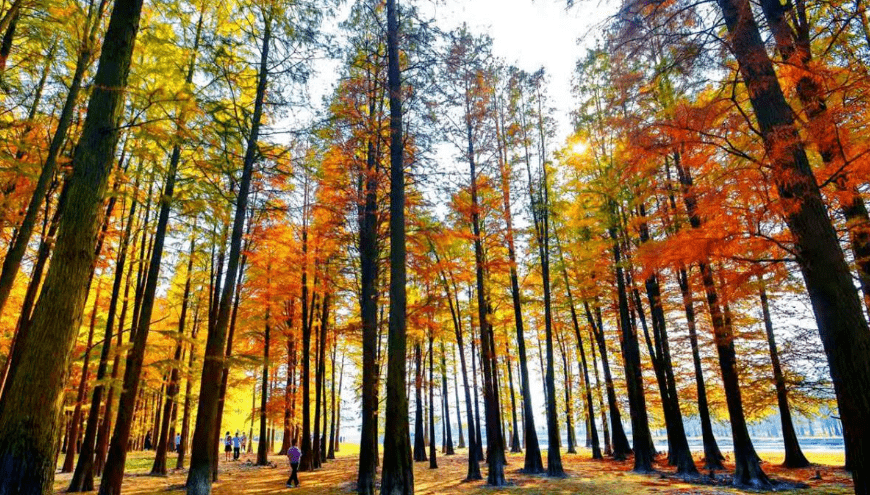 你说,就是这金銮般的银杏,火一样的水杉,旌旗状的枫树,给了东坡城市湿地公园,还有那如织的游人,不一样的秋色,不一样的壮美!