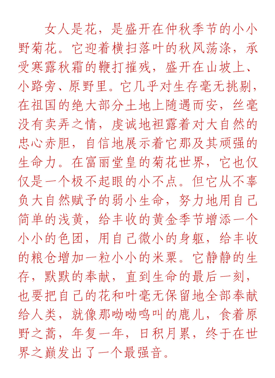 女人是花,是盛开在烂漫春光里的鲜花。大地脱下包裹得严严实实的冬装,春风就忙着剪开了温暖大幕的彩带,沐浴着春日暖阳的深情博爱,梨花穿着洁白的婚纱闪亮登场,桃花身着粉色的孕妇裙婀娜亮相,它们不负春光,娇羞矜持地向人类、向自然,奉献出一道最为靓丽的风景线。它们惊艳的魅力,唤醒了万物复苏,引领着花舞人间。正待到山花烂漫时,梨花谢了,桃花退了,它们很快在春天大舞台的前沿谢幕,低唱浅吟着“落红不是无情物,化作春泥更护花”。它们的离去,换来了挂满枝头的梨儿、桃儿,它们在春天里升华,成为了神圣的母亲。因此,花有了一个专业的书面定义:是用来欣赏的植物,是具有繁殖功能的变态短枝。
