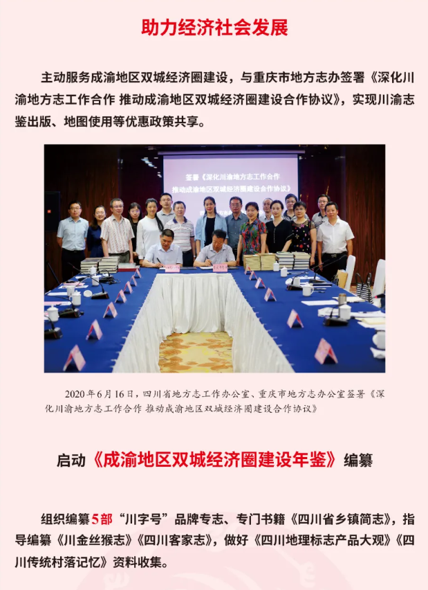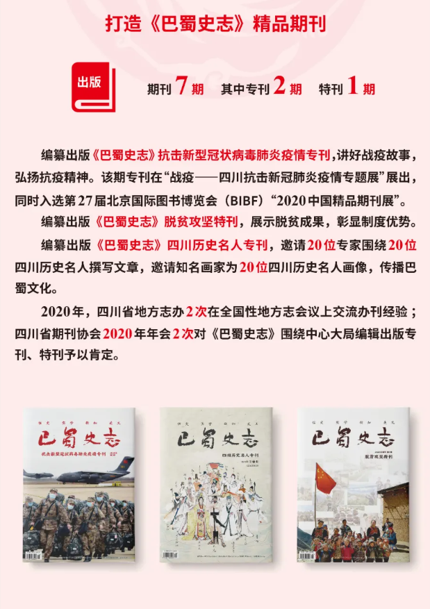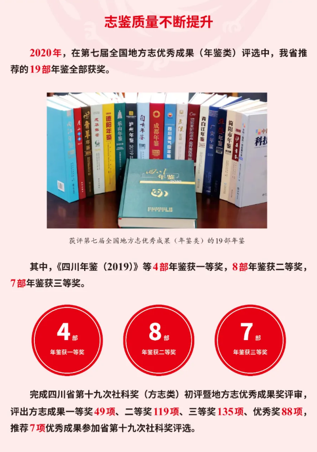“百啭千声随意移,山花红紫树高低。”这一年来,《深化川渝地方志工作合作 推动成渝地区双城经济圈建设合作协议》顺利签订;《巴蜀史志》入选第27届北京国际图书博览会(BIBF)“2020中国精品期刊展”;四川19部年鉴斩获全国地方志优秀成果评比大奖;四川省情网浏览量突破8378万次;“方志四川”新媒体矩阵关注用户突破6万,访问量1.37亿次,其中5篇文章阅读量在100万以上;“方志四川”澎湃号获“澎湃新闻·文旅传播奖”第三名,“方志四川”川观号获2020年度优秀政务类川观号;《忆沧桑·记奋斗·颂辉煌》《蜀韵纪事》《中国省别全志》等专题特色书籍编纂(译)发行;《四川年鉴(2020)》简本送交全省“两会”使用并广受好评……看硕果累累,听捷报频传,全省方志人心无旁骛、情有独钟,追逐地方志高牙大纛,一程山水一片心,一路奔跑一路歌;四川地方志工作豪情绽放、姹紫嫣红开遍,顾盼生辉、炫舞芳华无限……‘