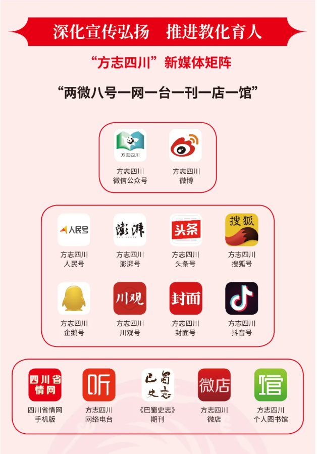 “智者达其言,劳者歌其事。”“一方之全史”“一地之百科”,毓万千灵魄,续人文荟萃,大道至简、静水流深;究天人之际,通古今之变,万世蒙庥、厥功至伟。巴蜀有志以来,世代薪火赓续,千年文脉络绎。“暮色苍茫看劲松,乱云飞渡仍从容”,今天,四川地方志视域和触角由边缘而中心、由冷僻而热络,日益成为弘扬优秀传统、宣传巴蜀文化、继承革命精神、演绎乡情乡愁的主阵地和大舞台……全省地方志从“一项工作”向“一项事业”的转型发展基本实现;四川省方志馆高校分馆在川渝地区6所高校揭牌开馆,“两微八号一网一台一刊一店一馆”新媒体矩阵覆盖度和影响力显著扩展,《巴蜀史志》“抗击新冠疫情”“脱贫攻坚”“四川历史名人”专刊特刊相继出版……全省地方志从“一本书主义”向“十业并举”的跨越态势初步呈现;四川地方志与人民网、中新社、四川日报、川观新闻、四川新闻网、华西都市报、封面新闻、成都人民广播电台、喜马拉雅等权威或新型媒体的合作纽带更趋紧密,立体多维讲述四川故事、传递四川记忆的“大方志”格局加速突破、方兴未艾……全省地方志从“清唱独奏”向“和音交响”的路径革新全面构建。