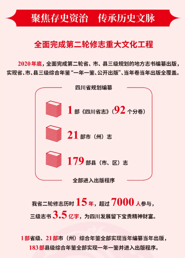 “故夫方志者,非直一州一邑文献之寄而已;民之荣瘁,国之污隆,于兹系焉。”江河不废,华章相属,社会主义新方志的编修实践,上承2000年史志滥觞,下启新时代岁月峥嵘,更是中华文化史上一曲具有开拓性、创造性、示范性和引领性的时代赞歌。自2006年以来,全省编纂出版省、市、县三级志书201部3.5亿余字,省、市、县三级综合年鉴2020卷205部1.2亿余字;至2020年,四川省第二轮修志任务圆满完成。“精诚动天地,丹恳在词文”,全省地方志部门和广大地方志工作者十五年如一日,甘守寂寞、无私奉献,以拳拳之热切皓首穷经,以恂恂之心力呕心沥血,苦行万里长路、笃留万卷长书,其规模之大、成果之丰、参与之众、影响之巨,“前不见古人,后以示来者”,其事昭彰,其功堂皇,势如高山景行、巍峨宽广,黄钟大吕、訇然八荒。