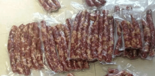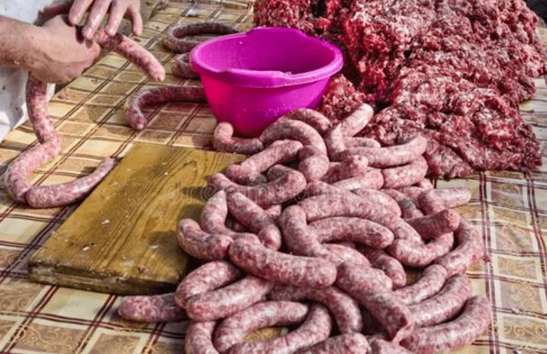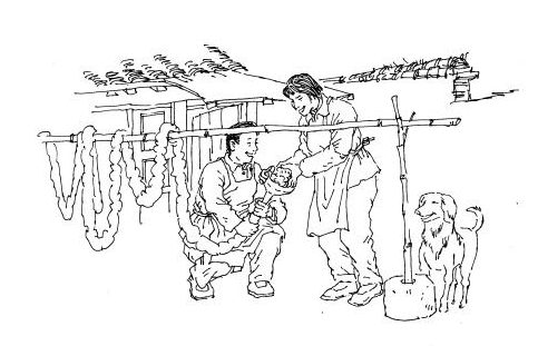 老妈从木盆里拿出泡有花椒、辣椒、盐、胡椒等的猪肉,将其切成小指拇大,左手紧握灌肠竹筒,右手不紧不慢熟练地把肉轻轻地放进灌肠竹筒口。随着老妈右食指用力朝筒口向下塞肉,那些美美的肉就乖乖地朝筒口直往灌肠里走。待灌肠里的肉差不多有两尺来长时,老妈就停止灌肉,两手均匀适力把肉朝灌肠下方不停地挤压。随后隔一手卡的距离,把那两尺来长的灌肠分成数个小节,用事先准备好的线把它们一小节一小节打上结巴。那时我最喜欢做的事,就是在此刻拿根小针在每个小节上扎上多少不均的针眼。