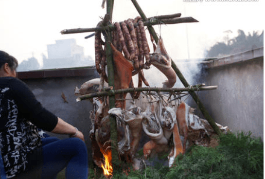 待腊肉香肠正式进入熏的阶段,方知其味美制作也特辛苦。那时老爸在江西铁路局上班,我家熏腊肉香肠和豆干,都是老妈一人完成。老妈把腊肉香肠半成品用铁勾勾住,均匀放在一个专门熏肉的铁架上,再在大柴灶里点燃柏丫与木头粉末。待它们在灶里燃到一定程度时,就用铁甲把灶里的明火打掉。随着一股股带有柏丫香味的烟味升起,整个灶屋里弥漫着肉香,并不时传来老妈被烟熏的咳嗽声。