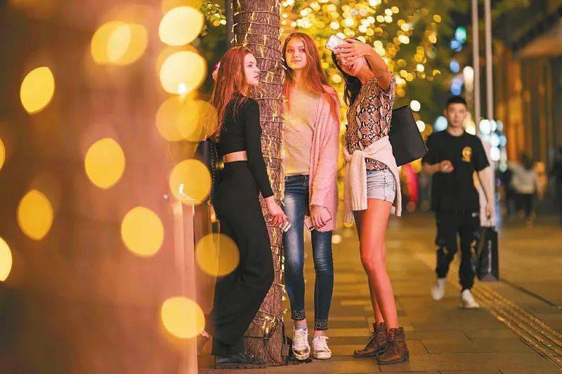 2019年4月19日,几名外国游客在成都街头合影 (四川日记者 尹钢 摄,图片来源:四川日报)