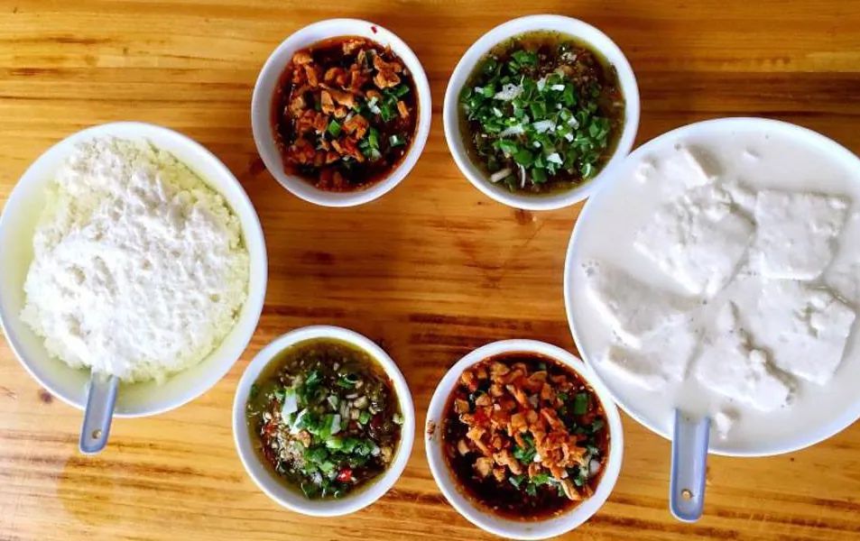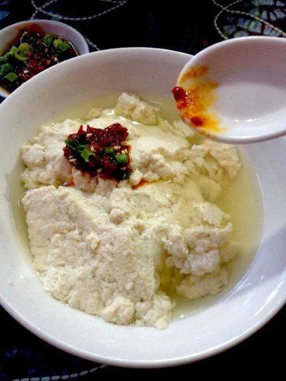 其实,廖老师的夸奖也不无道理,母亲做的豆花确实独特精细,工序复杂。首先,选择的原料就颇为讲究:黄豆要本地的浅绿色的、颗粒饱满的,凝固豆花用的卤水要自贡产的;做蘸水的青椒要云南来的;辣椒用七星椒且必须鲜亮大红的……俗话说,“鸡肉已上桌,豆花还没熟。”豆花制作过程说来简单,实际操作却十分精细、费时。老家流行的豆花是“黄姜豆花”,豆花压成后,热在锅里,用刀切成方块,再放到黄姜和花生浆混合的汤里煮沸,既有浓郁的花生香,又有惹食欲的淡黄色。“色”和“香”都有了,还差个“味”。母亲做的豆花蘸水也很讲究,渣渣肉炒宜宾碎米芽菜,配上油海椒、芝麻、味精、葱花、酥花生颗粒等佐料。这样独特的豆花能不好吃吗?