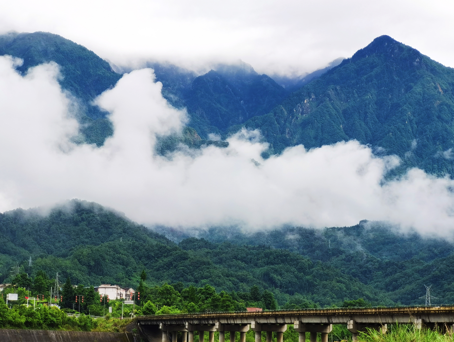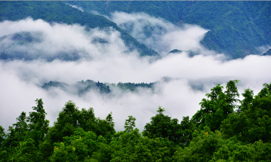 由龙门山、葛仙山山麓向上行走,远处,群峰如聚,山岚烟云,风起云涌。墨绿的山,洁白的云,青翠的森林,好一幅朦胧梦幻的仙山烟云图。
