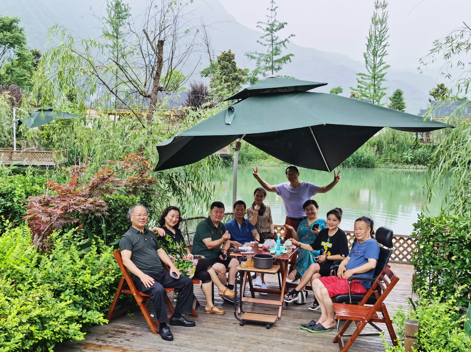 夕阳西下,湖畔清风徐来。这里,初夏的深山,日均气温仅17度左右,真乃清凉爽快“夏如秋”。这时,别墅门口湖畔的钓鱼平台上、遮阳巨伞下,围坐品茗、聊天,成为“后天亲人”们的共同选项。