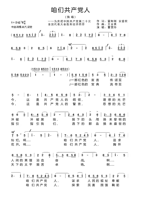 今年下半年,中国共产党第二十次全国代表大会将在北京召开,这是我们党团结带领全国各族人民进入全面建设社会主义现代化国家、向第二个百年奋斗目标进军新征程的重要时刻召开的一次重要的大会。为喜迎这一伟大的盛会,表达人民群众对新时代祖国繁荣富强的祝福和对美好新生活的向往,词作家雷辉刚、安登权作词,作曲家王金贵,著名歌唱家曹慧玲联手打造了歌曲《咱们共产党人》。此歌直抒胸臆,唱出了咱们共产人的本色。进入新时代,开启新征程,续写新篇章,正需要我们共产人一代又一代接力,撸起袖子加油干,带领各族人民走向辉煌,走向复兴。