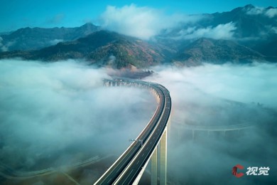 四川在线 C视觉摄影师 胡宇层峦叠嶂,云雾轻飘;高桥飞架,直破云霄。2月26日清晨,一场春雨过后,绵阳市平武县县城放晴,城市周边云雾缭绕。九绵高速平武涪江特大桥再现“云端高速”美…