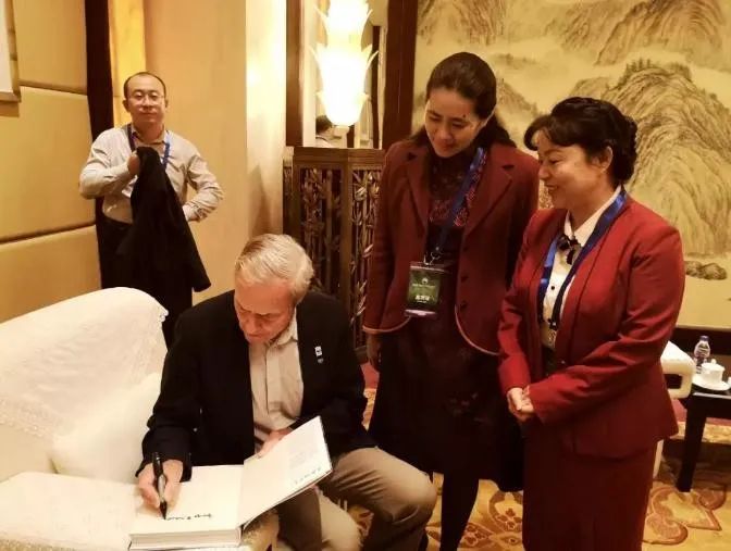 2019年9月29日,世界最杰出的野外生物学家、第一个受委托在中国为世界自然基金会(WWF)开展工作的西方科学家乔治·夏勒在《大熊猫图志》上签名(右一为四川省林业和草原局副局长包建华,右二为四川省地方志工作办公室副主任赵行,包建华供图)