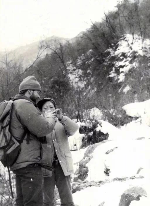 1982年,秦自生教授与外国专家艾伦·泰勒在王朗大熊猫栖息地科考(邓任远 供 图)