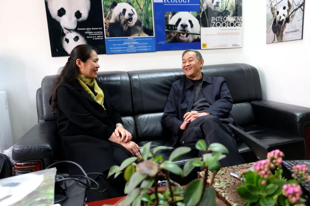 2019年3月8日,四川省地方志办副主任赵行在中国科学院动物研究所就编纂《大熊猫图志》拜访“熊猫院士”魏辅文(何晓波 摄)