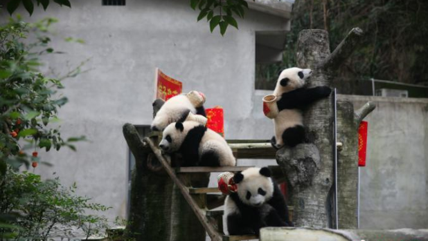 2020年1月21日大熊猫双胞胎幼仔“双双”“重重”和“喜喜”“庆庆”用小竹篓背着“年货”,给已经37岁的“曾祖母”大熊猫新星拜年(图片来自网络)