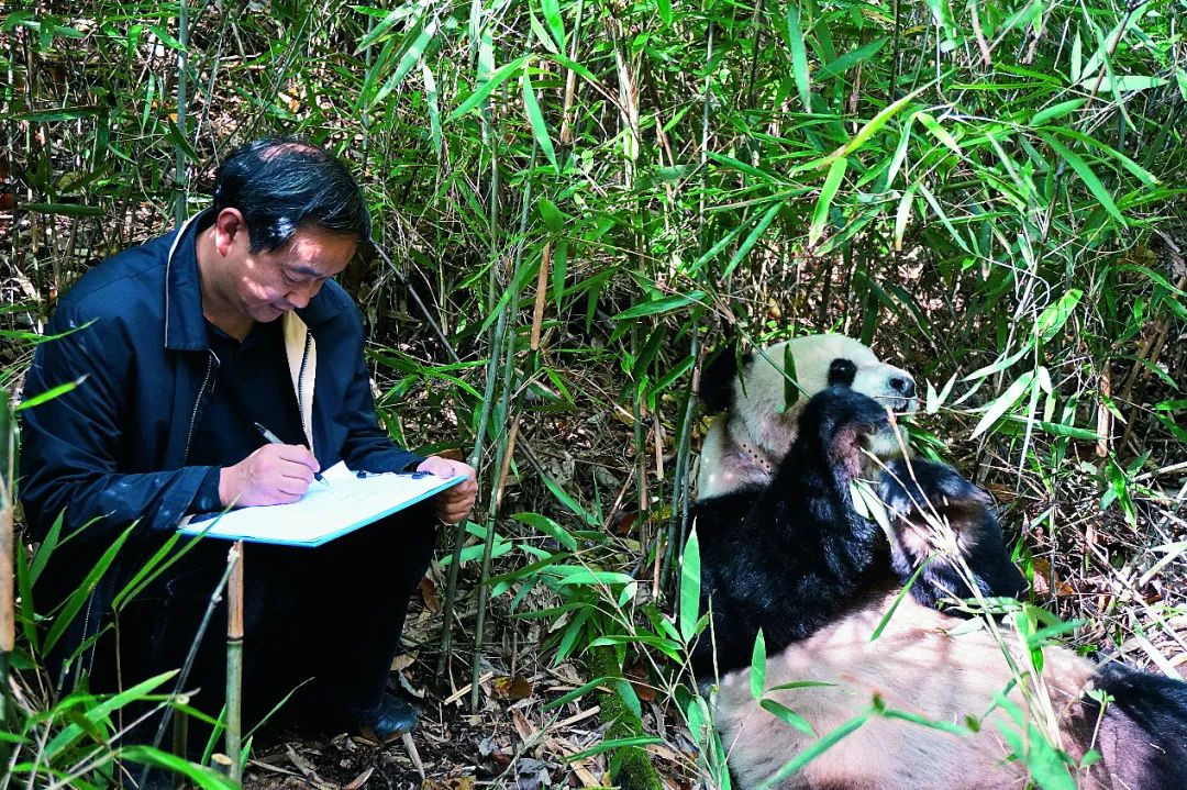 中国科学院院士魏辅文在观察野生大熊猫进食(图片来源:魏辅文著《野生大熊猫科学探秘》,科学出版社,2018年)