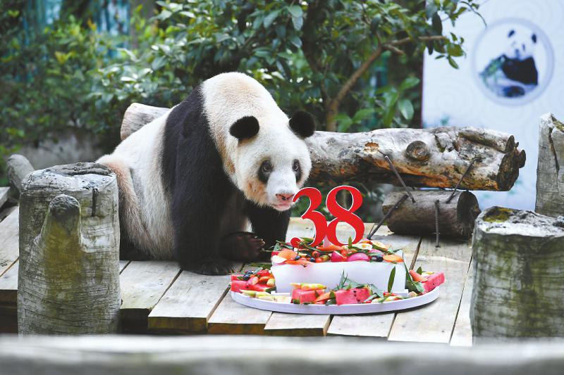 8月16日,大熊猫“新星”在38岁生日会上享用水果生日蛋糕。当日,世界现存最年长圈养大熊猫“新星”迎来38岁生日,重庆动物园为“老寿星”举行了生日会。“新星”的年龄相当于人类的110至150岁,目前身体状况良好。