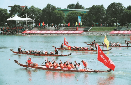6.端午龙舟竞渡。南朝梁宗懔《荆楚岁时记》记载:“是日,竞渡,采杂药。按:五月五日竞渡,俗为屈原投汨罗日,伤其死,故并命舟檝以拯之。舸舟取其轻利谓之飞凫,一自以为水军,一自以为水马。州将及士人悉临水而观之。”成都地区过去流行一首民歌叫《十月看花》,歌中唱道:“五月收拾去看花,一对龙船水中划。六十六根花桡片,划来划去满河花。”