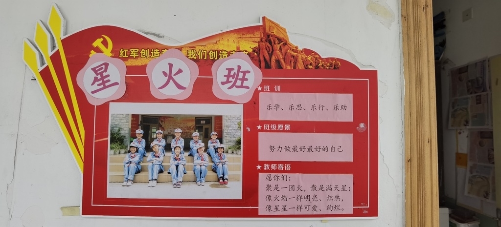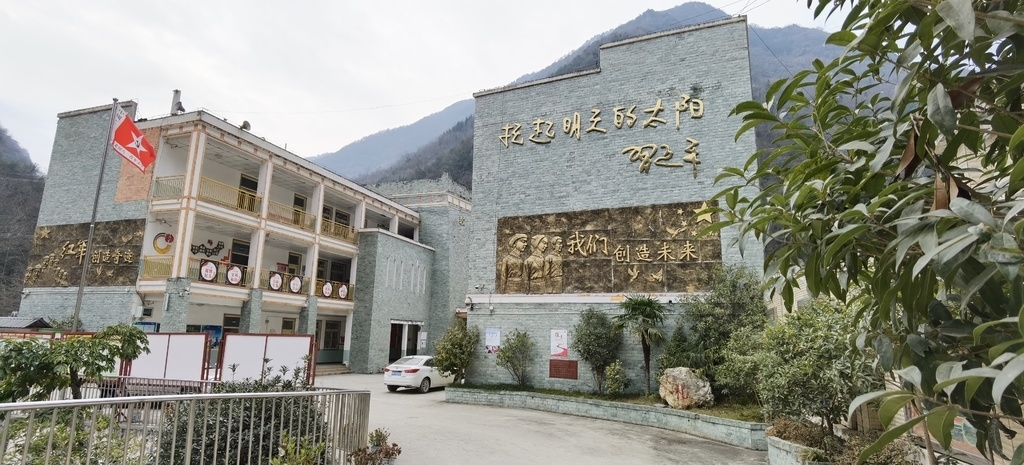 这所羌山深处的小学以红色文化命名班级名字,每层楼的读书角都堆放着红色经典书籍。每个学期,孩子们还会进行红色诗词、红色图画创作。