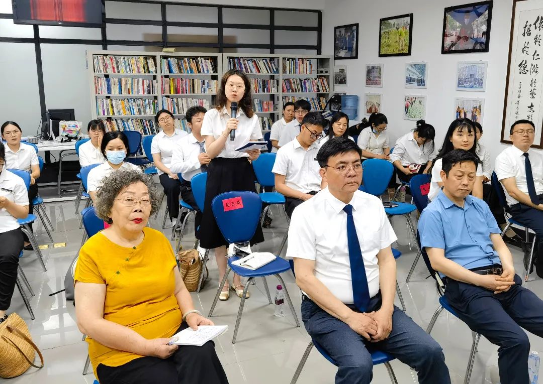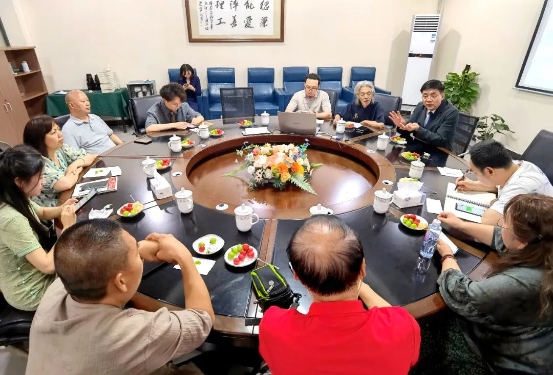 学校总校长王琳博士(左一)向省直作家一行介绍学校发展情况