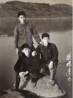 1973年秋季,郑建国(站立),樊建川(前坐)与我(右蹲)在拉练途中,金沙江畔合影留念(樊建川 供图)
