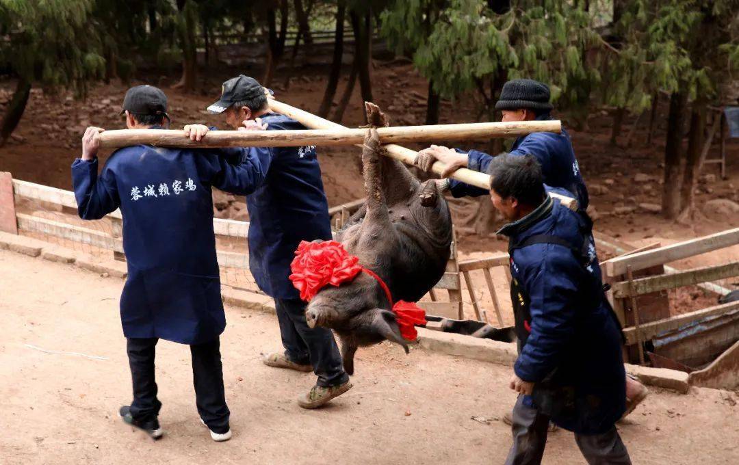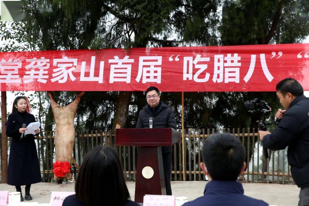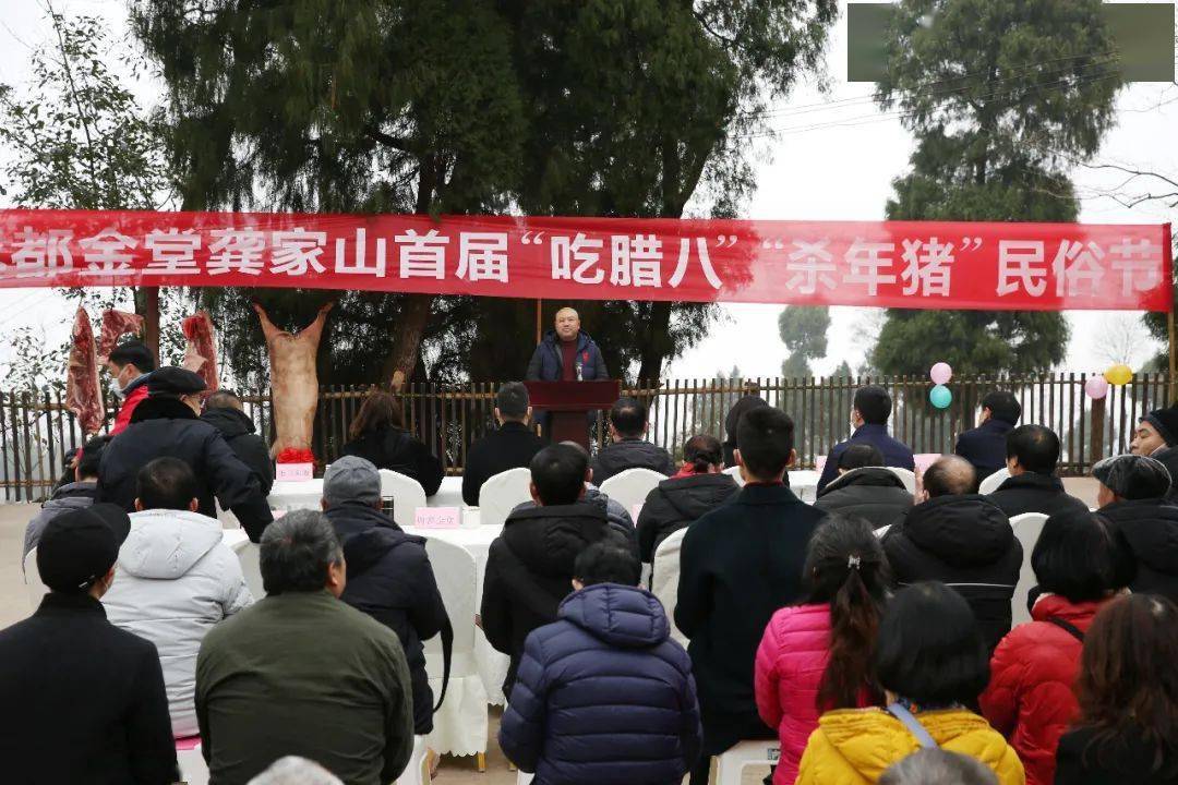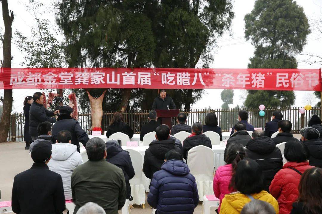 “大寒小寒,杀猪过年”!2022年12月30日,腊月初八,薄雾缭绕的龚家山人头攒动,热火朝天。金堂县乡村振兴中心、金堂县工商业联合会主办,龚家山百凤缘农场、龚家山村、四川天府橄榄旅游开发有限公司承办的成都金堂首届“吃腊八”“杀年猪”民俗节,在龚家山百凤缘农场拉开序幕。金堂县政协副主席钟国金参加活动并宣布活动开幕。