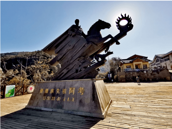 矗立在新山村广场上的阿考雕像碑刻显示:“阿考是傈僳族开天辟地的英雄,也是傈僳族的人文始祖。据傈僳族《阿考诗经》记载,他身躯高大,健壮英俊,是傈僳族的第一伟男子。足智多谋,上知天文地理,下晓民间疾苦,敢于与大自然搏斗,驱魔赶妖,使天下风调雨顺,五谷丰登,确保了傈僳族人的世代平安。他定制礼仪,让傈僳族全体社会成员在生产、生活中有章可循。阿考喜骑高大骏马,云游天地,行走四方,扶正压邪,是傈僳族人膜拜的神仙,也是傈僳族人爱戴的始祖。”