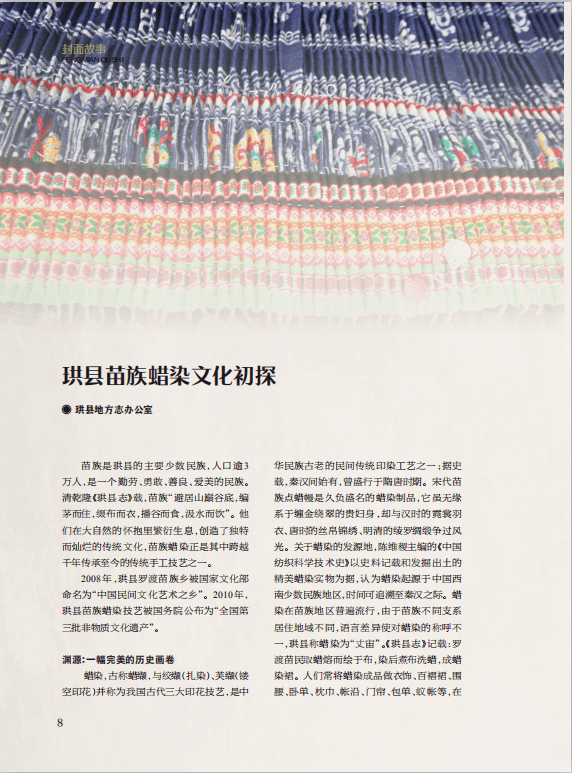 蜡染,古称蜡缬,与绞缬(扎染)、芙缬(镂空印花)并称为我国古代三大印花技艺,是中华民族古老的民间传统印染工艺之一;据史载,秦汉间始有,曾盛行于隋唐时期。宋代苗族点蜡幔是久负盛名的蜡染制品,它虽无缘系于缠金绕翠的贵妇身,却与汉时的霓裳羽衣、唐时的丝帛锦绣、明清的绫罗绸缎争过风光。关于蜡染的发源地,陈维稷主编的《中国纺织科学技术史》以史料记载和发掘出土的精美蜡染实物为据,认为蜡染起源于中国西南少数民族地区,时间可追溯至秦汉之际。蜡染在苗族地区普遍流行,由于苗族不同支系居住地域不同,语言差异使对蜡染的称呼不一,珙县称蜡染为“丈宙”。《珙县志》记载:罗渡苗民取蜡熔而绘于布,染后煮布洗蜡,成蜡染裙。人们常将蜡染成品做衣饰、百褶裙、围腰、卧单、枕巾、帐沿、门帘、包单、蚊帐等,在婚丧嫁娶、节日庆典等活动中,蜡染服饰是不可缺少的标配,对蜡染的崇尚千年不改,已成为苗族同胞生活中不可缺少的民间手工技艺。