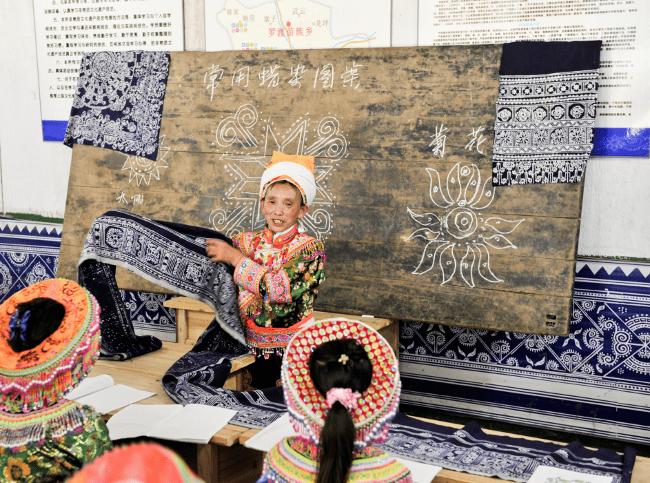 可喜的是,珙县苗族蜡染尽管面临现代工业文明的强势冲击,但仍保持着独特的民族风格和地方特色,尽享“土”的韵味。目前,珙县已建成县、乡、村三级传承保护基地,打造集展陈、研发、体验为一体的蜡染技艺传承保护展示中心,设置蜡染实训课堂、教学厅、成品展示厅等,并配备相关设备,鼓励代表性传承人开展培训,将蜡染技术与僰苗文化特色旅游有机结合,打造古僰文化之乡。而今,蜡染艺术的欣赏与应用已不限于苗族群体,蜡染制品的多样化、商品化色彩更加突出,珙县苗族蜡染已走出大山,频频亮相于各类展览,让世人惊叹!
