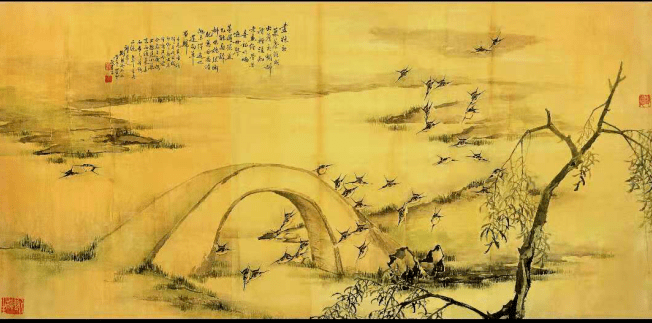 画上有小桥流水、古柳稚芽;有春燕翻飞、喧嚣鸣叫,题画诗则表明了作者眼见乳燕离巢、念母又归的人性化情景的惊喜和对湖边春景的陶醉。雏燕春柳的蓬勃生机与古桥湖石的厚重沉稳,形成鲜明对比,而湖边的那株老柳和飘拂的柳枝,恰如一位历经沧桑的老人,捋须而立,欣赏着这春光美景……