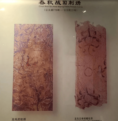 春秋战国时期的刺绣,以战国楚墓出土的刺绣最具代表性:主体常用多行锁绣覆盖,图案多见动感十足的蟠龙飞凤,穿梭于流云、枝蔓之中,颇富浪漫色彩和韵律感,仿佛把人带回了那个刀光剑影、群雄并起的战争年代。
