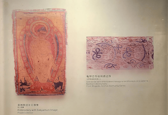 魏晋南北朝的刺绣也别具特色:在民族融合与中西方交流的大背景下,刺绣得以发展。其图案除了忍冬纹、花鸟纹外,题材还涉及佛像及佛教用品;主用锁绣法,针线细密、满地施绣,配合三晕配色法,加大了刺绣表现力。