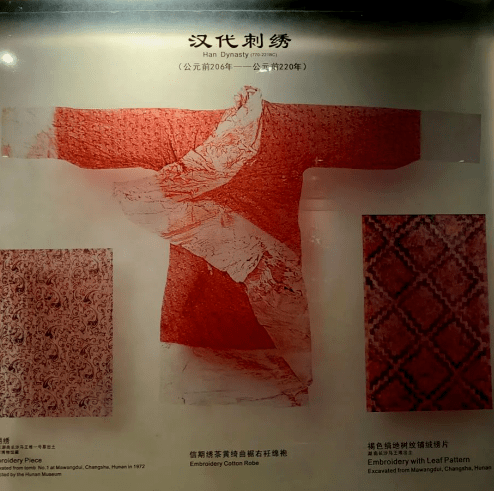 到了汉代,刺绣从专业生产到广泛应用于服饰、装饰、日用品,绣品底料多为绢,针法以锁绣为主、平绣为辅。图案常用云纹、卷草纹。风格细匀、连绵,其飘动之感为汉代刺绣所独有。