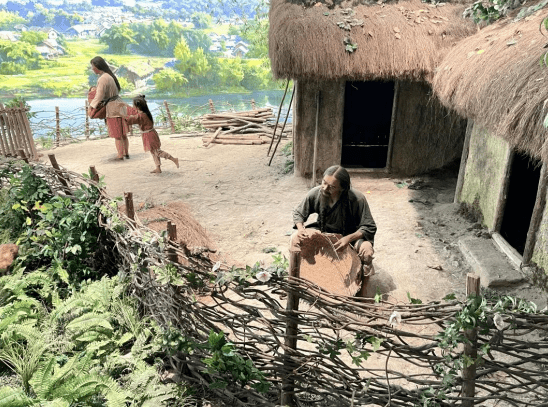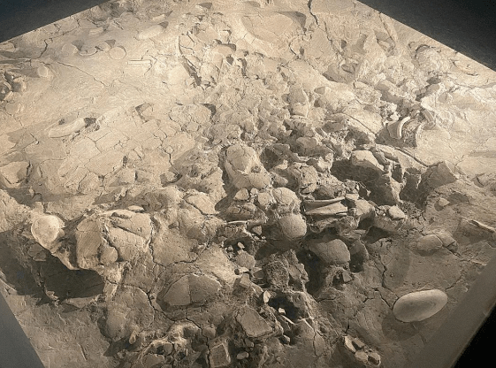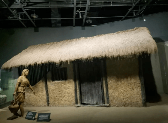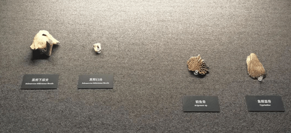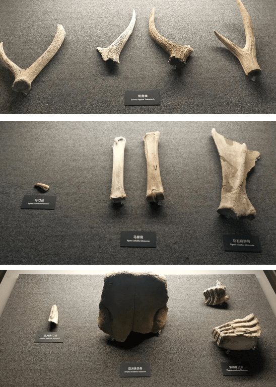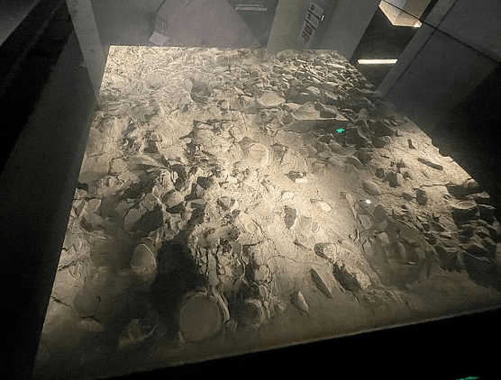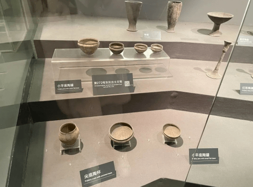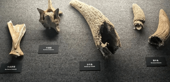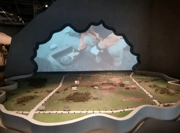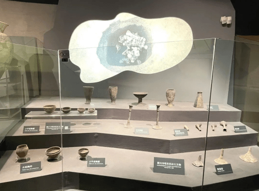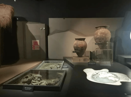 在展厅的底下,则是27号陶器遗迹套箱,俯身便可近距离观察远古时期的陶器遗迹。除此,第一展厅里还陈列了出土的动物骨骼、枫杨、红椿、楠木等,与背景画一起营造了远古时期原始的气氛,让人感觉身临其境。