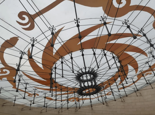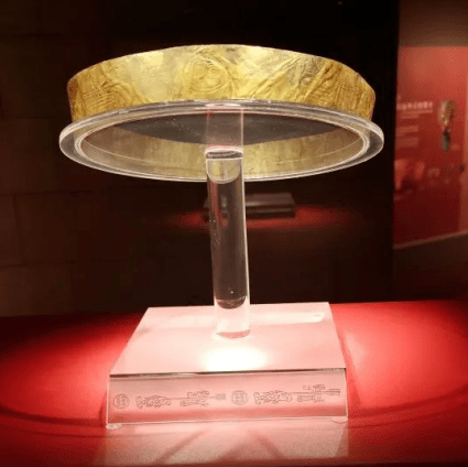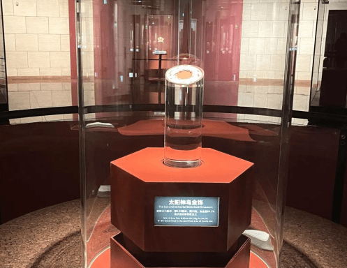 来到该展厅,不能忽视的就是中心展示的镇馆之宝——“太阳神鸟”金饰。这件金饰是使用了含金量高达94.2%的黄金,最终制作成的厚度只有0.2毫米的金箔片,上面还镂空出精美的纹饰,堪称当时中国黄金工艺的一件杰作。金箔上有两层镂空图案,内层为等距分布的十二芒太阳纹,外层由四只等距分布相同的鸟构成。目前一般认为,金箔中央带十二刺芒的图案代表太阳,而周围的四只鸟则代表传说中的“金乌”,体现了古蜀人对太阳的崇拜。