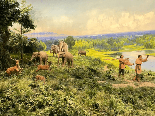 这个场景表现的是3000多年前金沙人生活的地方。金沙人的家园在广袤的成都平原上,这里地形平坦广阔、河网密布、植被茂盛,非常适合人类生存。从考古发现的情况看,金沙人就生活在河流两岸,从事农业、手工业、渔猎等活动。