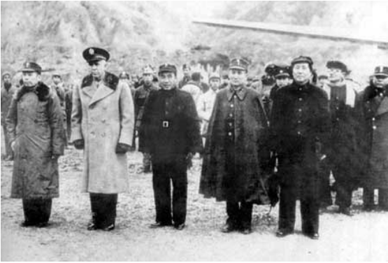 1946年在延安留影(左起:周恩来、马歇尔、朱德、张治中、毛泽东、林伯渠)
