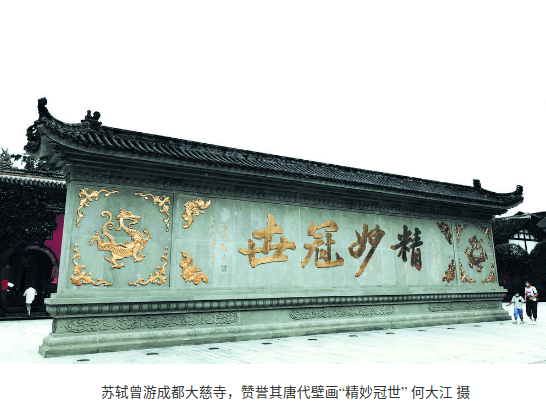 嘉祐初年,苏洵见苏轼、苏辙学业有成,文才初露,于是来到成都拜访张方平。在成都,苏轼拜访了同宗兄弟苏惟简,苏惟简是大慈寺的主持。兄弟情深,苏轼为大慈寺留下了不少墨宝。在欣赏了寺内唐代画家卢椤伽笔迹以及唐僖宗与从官文武75人画像后,苏轼赞赏有加,题名:“至和丙申季春二十八日,眉阳苏轼与弟苏辙来观卢椤伽笔迹”,并写了“精妙冠世”4个大字。“乌台诗案”后,苏轼被贬黄州,宝月大师苏惟简还派亲信悟海前去探望,并希望苏轼为大慈寺“大宝藏”作记。1095年,宝月大师圆寂葬于成都城东塔子山,苏轼悲戚而作《宝月大师塔铭》。
