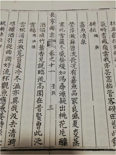 嘉鱼泉的历史属性,最早见于记载是在宋代。长宁军文学王象之编纂的《舆地纪胜》记载:“嘉鱼泉在城东一里,马鞍山之址。泉漱石涌出,有小鱼,四时如一,不增不减,故名”。《舆地纪胜》同时也是目前发现的关于长宁最早记载的文字。
