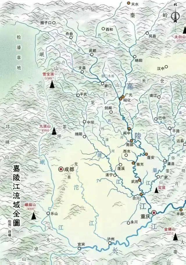 嘉陵江水系呈扇形分布,像极了一棵参天大树,牢牢扎根于长江干流和“中华之心”上,疏枝散叶,根深叶茂。铺开中国地图,可以清晰地看见,嘉陵江流域连同被其夺源的汉江流域,正处于中国地理的几何之心上。嘉陵江的中干只有1345公里,但其流域面积却逾16万平方公里,相当于一个半江苏或一个广东省那么大,正哺育着4000多万人口,是我国流域面积最大、哺育人口最多的内河。综合最新田野考古、地质考古和史简《竹书纪年·大昊》《山海经》《补史记·三星本纪》等记载,宋代史学家罗泌在《路史》中考证的“太昊伏羲氏,母华胥,居于华胥之渚”“所都国有华胥之渊,盖华胥居之而名,乃阆中渝水地也”,即“中华始母”华胥主要生活在嘉陵江中上游所言非虚,否则,“教人们织网捕鱼”“在沼泽履雷神印受孕”“生伏羲于天水”“生女娲于南池”“女娲补天”等故事的逻辑就说不过去。唐代杜甫专临阆中考察,那时的南池还是一片泽国,但南宋陆游来时,已为沼泽,开始干枯了。华胥女娲后若干年后,我们中华民族的又一位老妈妈——黄帝元妃嫘祖降生在这里的盐亭,她在这里教人们栽桑养蚕、抽丝织布,是为丝绸之源。唐朝母仪天下的一代女皇武则天在嘉陵江上游的广元出生,而后“花木兰”韩娥、才女黄娥、“巴山红叶”尹清平、何林芝、王定国等无数美女、才女、奇女子在这里出生、成长。“昭化美女多,重庆是个窝”,嘉陵江是中华民族当之无愧的母亲河之一,是中华民族生生不息的重要源泉。母亲的怀抱总是那么宽广而温暖,嘉陵江的柔波,永远荡漾在我们的心头。
