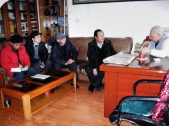 2011年,著名作家马识途(右一)接见司马相如研究会理事长赵正铭(右二)、副理事长邓郁章(右三)、《南充日报》记者杨东松(左二)、副理事长魏赤中(左一)等有关人员