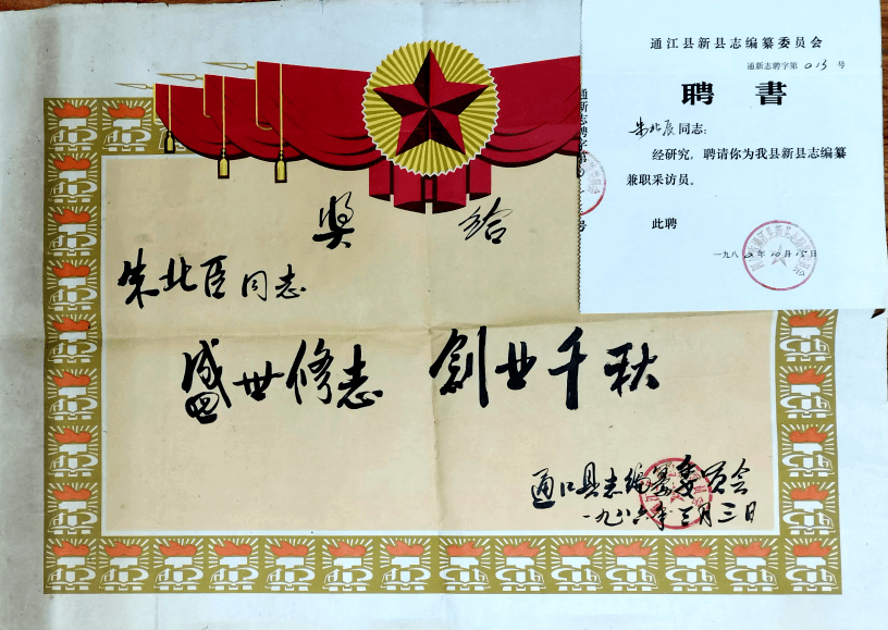 退休后,先生耳聪目明,精神矍铄,积极参加《通江县志》和县直部门志、乡镇志编纂工作,并被通江县新县志编纂委员会聘为兼职采访员。由于年龄考虑,县志办便安排他带回残缺旧县志回家校补抄录。先生根据回忆,写出了很多县内知名人物传记,写出了通江城镇建置沿革、《对通江县志传罗文杰质疑》等史实文稿,写有《王平寨战事》《李翰林栽七水》等纪实文章,写有《钓鱼石记》等文言散文,回忆写下乡贤蒲席珍先生和青城山长联,抄录了许多有参考价值的诗词、碑文、辞赋,为《通江县志》编写提供了重要材料。由于他在县志、部门志、乡镇志等方面工作主动认真,成绩突出,1986年被通江县志编纂委员会评为“修志先进工作者”,受到表彰奖励,真可谓:盛世修志,创业千秋。